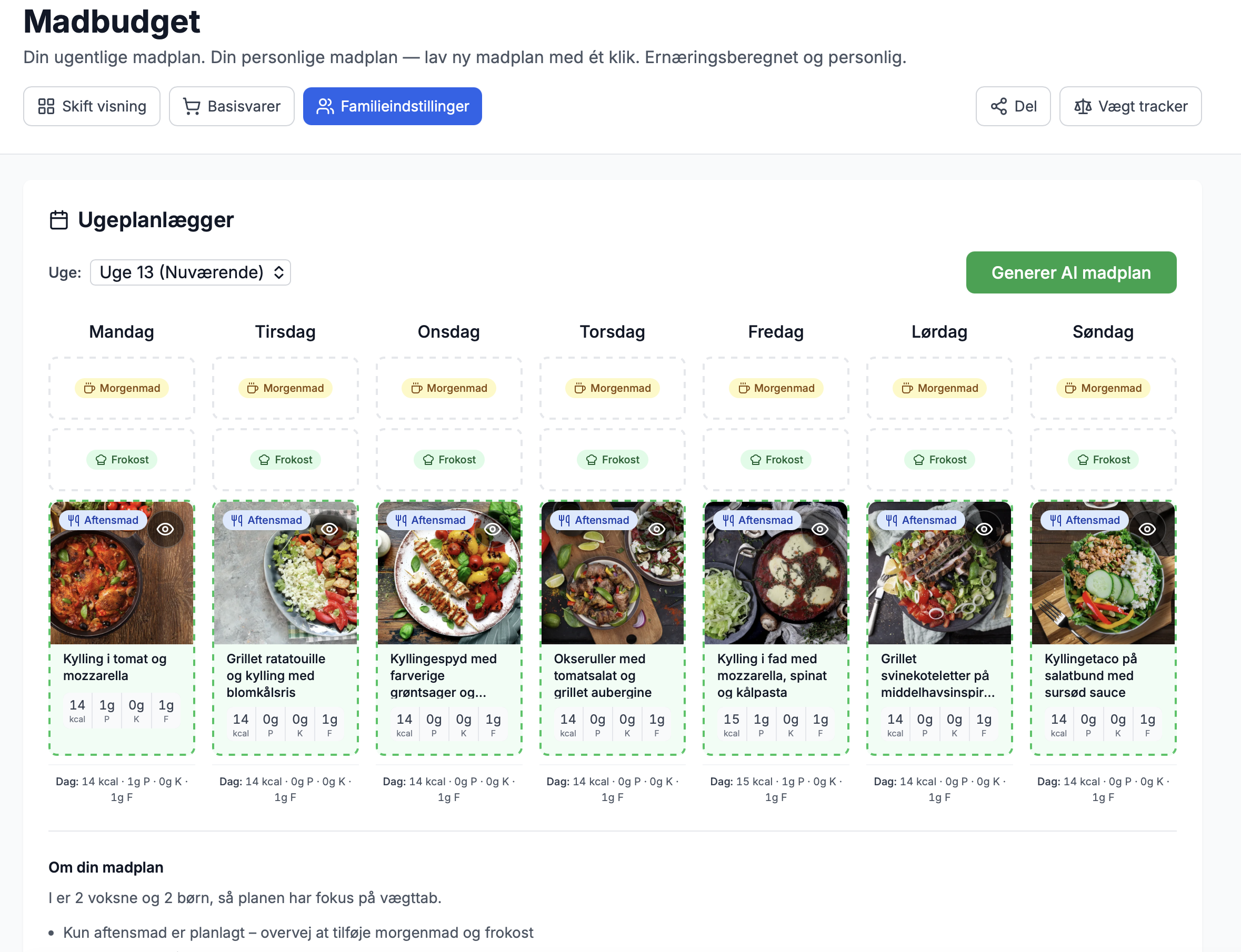 Planen tager udgangspunkt i hvor mange I er, hvad I kan lide, og hvordan ugen ser ud – ikke en generisk skabelon.