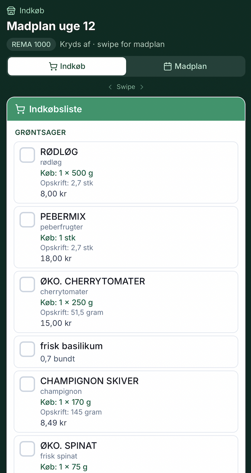Listen samler det, du skal bruge til ugen – formateret så du kan bruge den i butikken fra telefonen, inkl. deling og afkrydsning når du er logget ind.