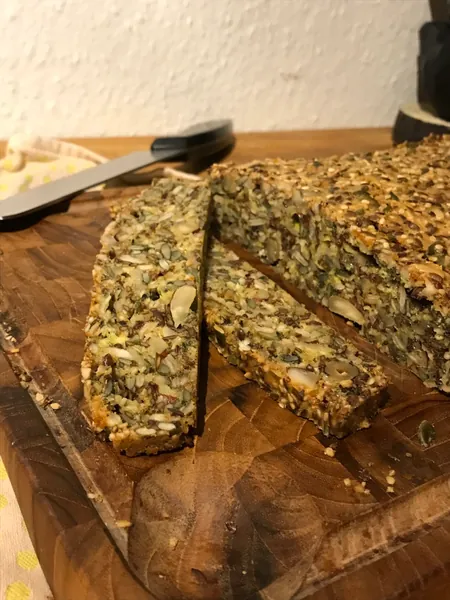 Retten er baseret på dette stenalderbrød. Skær brødet og tilføj dit pålæg