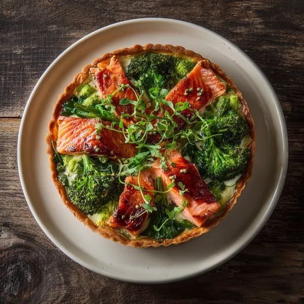 Dansk grøntsagstærte med bagt laks og hørfrø