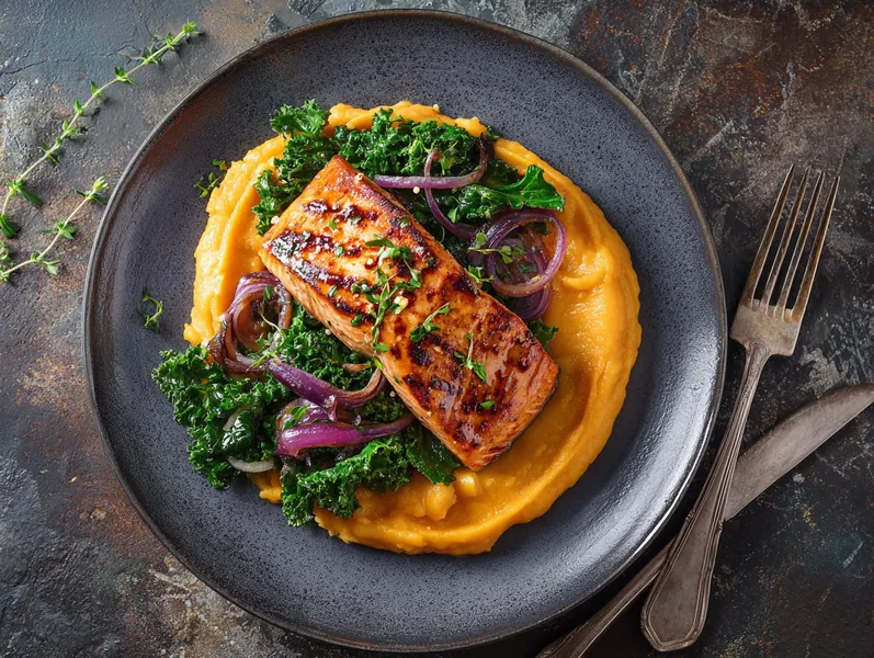 Anret laksen oven på et lag af sød kartoffelpuré, og server med stegt grønkål og rødløg ved siden af.