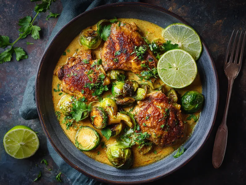 Kylling i krydret kokoscurry med rosenkål og lime