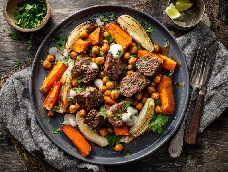 Ovnbagt oksekød med ingefær-lime og søde kartofler